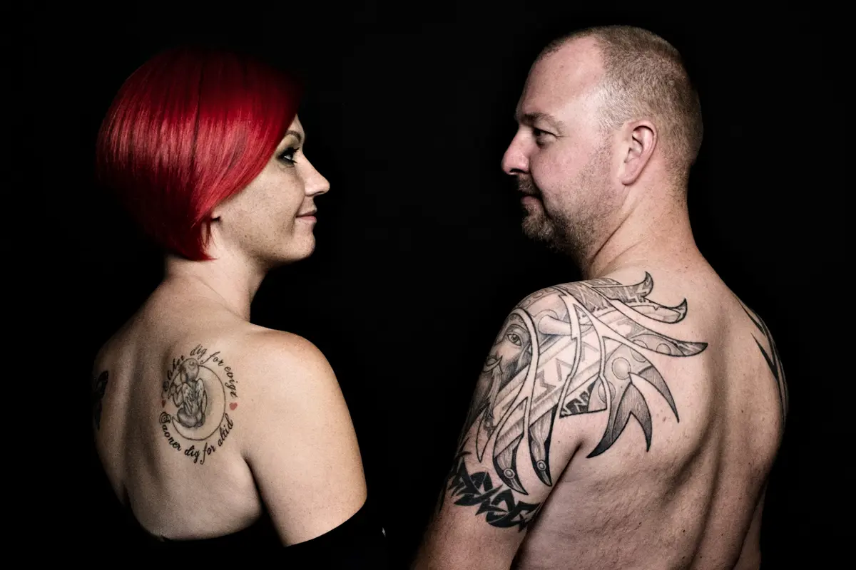 “Jeg er glad for det! Det er flot, og det er os, som vi er. Det er sådan, vi ser ud til hverdag, og det virker hverken opstillet eller kunstigt. Tatoveringen er i fokus, men det er også følsomt, fordi vi er der sammen, og vi kigger på hinanden. Der er noget i mellem os. Det var lidt underligt, da vi stod der og kiggede hinanden i øjnene. Fem minutter var godt nok lang tid. Men, jeg synes, at billedet er sårbart, fordi vi stod dér i de lange fem minutter. Jeg er rigtig glad for, at Jan besluttede sig for at være med. Nu blev det vores billede, og det gav mening, for det var jo vores barn.